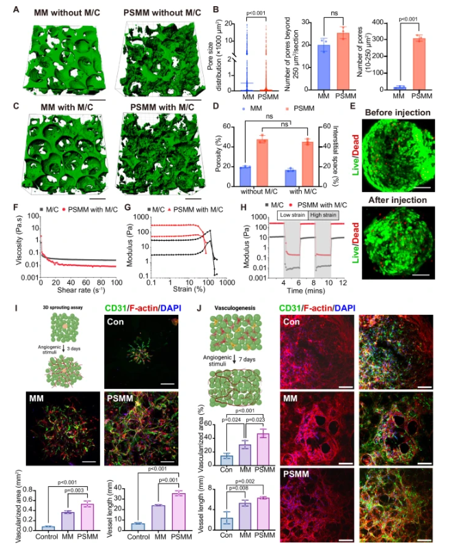 中风干细胞治疗受限于细胞存活率差和在缺血微环境中的整合性。注射微胶因其促进细胞浸润的能力被广泛应用于细胞递送,但密集的水凝胶网络常常限制细胞存活。这篇介绍一种可注射的微凝胶-基质复合支架,结合了用于神经前驱细胞(NPCs)递送的微孔微凝胶与间质空间以支持血管生长。采用气体剪切制备方法,初级大鼠NPC被高效包裹在相分离微孔微凝胶(PSMM)中,展现出优越的生存率和增殖率。体外研究表明,PSMM支架支持内皮细胞(EC)的萌发和血管形成,在缺血性卒中大鼠中,这种支架显著提升了NPC负荷能力、存活率和分化率,同时增加了EC的增殖和浸润。最终,微凝胶基质支架增强了中风模型中的神经长期恢复,提供了一种高效策略,将高细胞负荷与血管形成相结合,推动再生医学的发展。