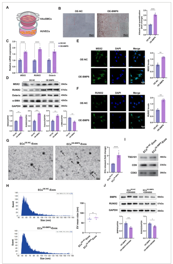 A)HAoSMCs和HUVEC共培养系统的示意图。下腔室的HUVECs在24小时前用BMP6过表达质粒或空载体对照(OE-NC)质粒转染,并与上腔的HAoSMCs共培养48小时,使用六孔跨孔单元。