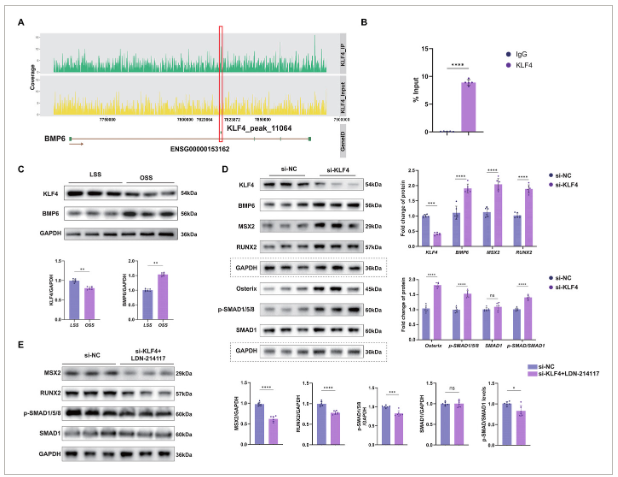 D)对与含si-NC(负对照小干扰RNA[siRNA])和si-KLF4转染的HUVEC共培养的HAoSMCs中KLF4、BMP6、MSX2、RUNX2、Osterix、p-SMAD1/5/8和SMAD1的蛋白质表达水平进行了Western blot分析。GAPDH被用作装载控制(虚线框)。蛋白质表达水平的定量数据见右侧(n = 6)。E)在与用si-KLF4转染的HUVECs共培养并可与LDN-214117处理的HAoSMCs中,进行MSX2、RUNX2、p-SMAD1/5/8和SMAD1的Western blot.