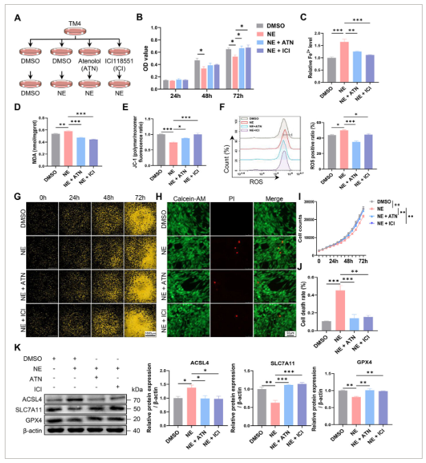 A) TM4细胞用NE、阿替洛尔(ATN,β处理1-AR特异性,1微米),或ICI118551(ICI,β2-AR特异性,1微米)。K) 对每个处理组TM4细胞裂解液中的ACSL4、SLC7A11和GPX4表达进行Wb 分析(n = 3–4)。数据以SEM均值±呈现。